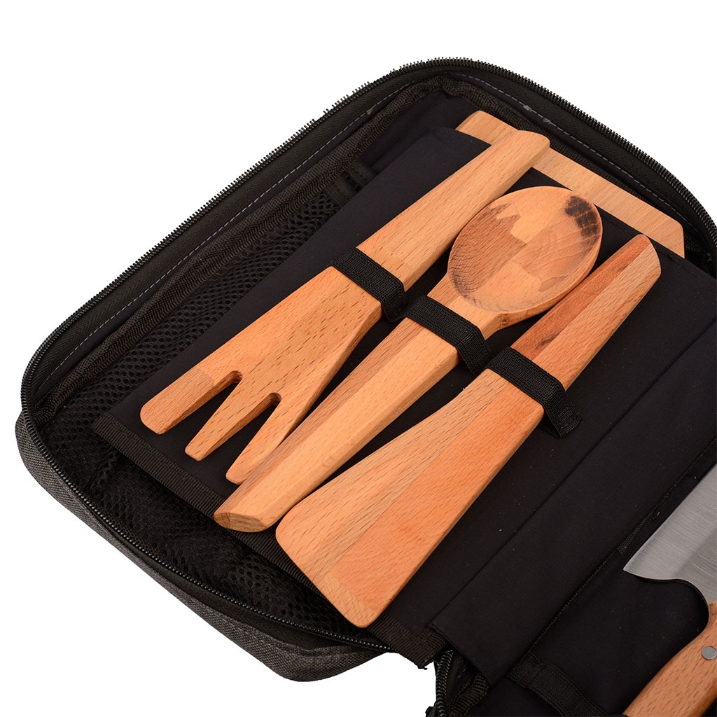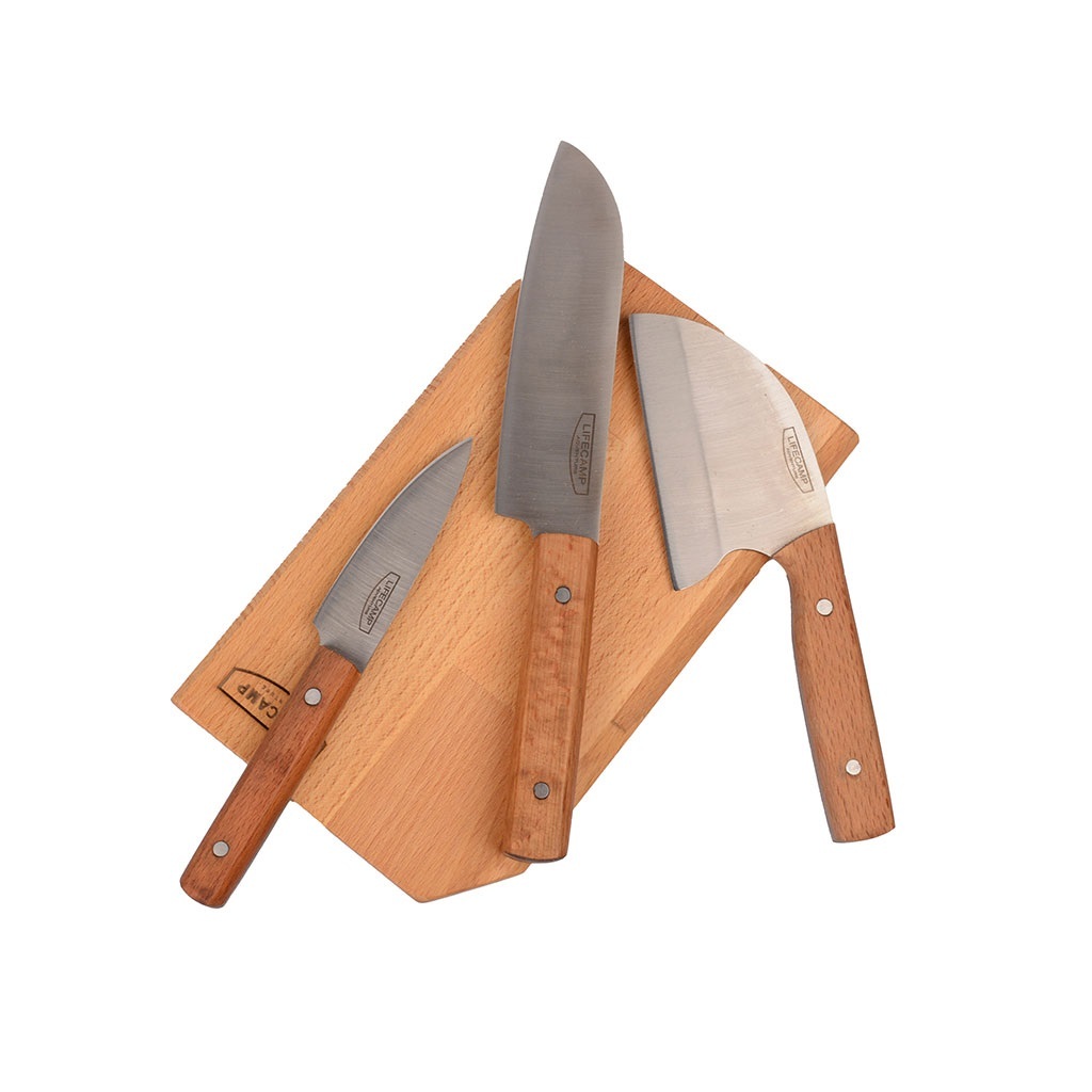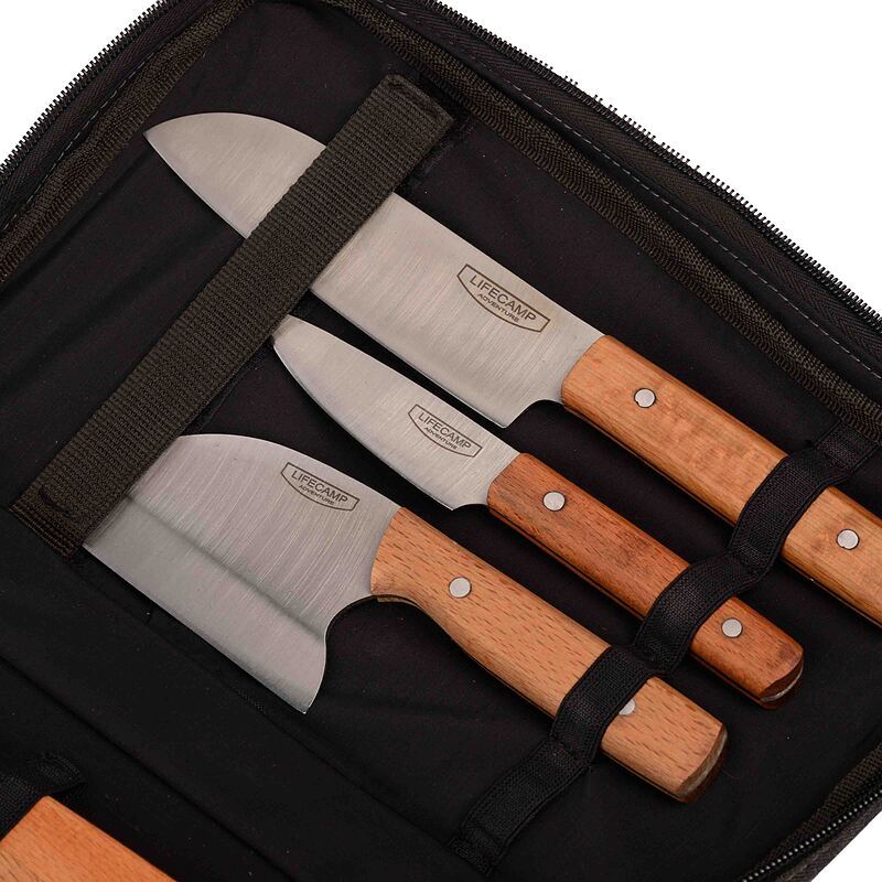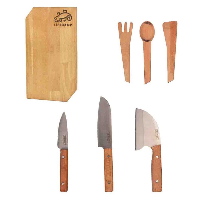 ست چاقو لایف کمپ مدل 7 تکه صربستانی شامل دو عدد کارد 20 و 28 سانتی متری، یک عدد ساطور 22 سانتی متری، قاشق و چنگال و برگردون چوبی و تخته برش از جنس چوب فینگر جویند راش به همراه کاور حمل برزنتی است که مجموعه ای بسیار کاربردی و کامل برای آشپزی در طبیعت و منزل میباشد که به علت حجم و وزن کم، میتوان آن را درون کوله به راحتی حمل کرد.مجموعه چاقو و لوازم آشپزی لایف کمپ، انواع نیاز های شما هنگام آشپزی در شرایط مختلف را مرتفع میکند و مطمئنا برای سر آشپزان حرفه ای نیز به علت کیفیت و دقت ساخت بسیار بالا، کاربردی و جذاب خواهد بود.
